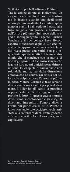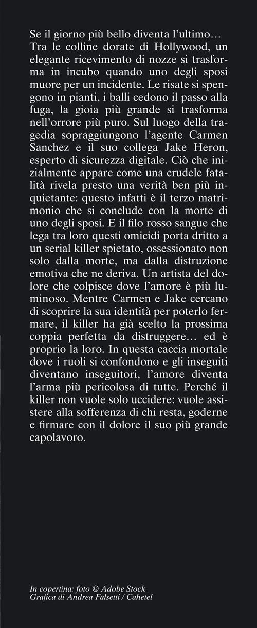 Tra le colline dorate di Hollywood, un elegante ricevimento di nozze si trasforma in incubo quando uno degli sposi muore per un incidente. Le risate si spengono in pianti, i balli cedono il passo alla fuga, la gioia più grande si trasforma nell'orrore più puro. Sul luogo della tragedia sopraggiungono l'agente Carmen Sanchez e il suo collega Jake Heron, esperto di sicurezza digitale. Ciò che inizialmente appare come una crudele fatalità rivela presto una verità ben più inquietante: questo infatti è il terzo matrimonio che si conclude con la morte di uno degli sposi. E il filo rosso sangue che lega tra loro questi omicidi porta dritto a un serial killer spietato, ossessionato non solo dalla morte, ma dalla distruzione emotiva che ne deriva. Un artista del dolore che colpisce dove l'amore è più luminoso. Mentre Carmen e Jake cercano di scoprire la sua identità per poterlo fermare, il killer ha già scelto la prossima coppia perfetta da distruggere... ed è proprio la loro. In questa caccia mortale dove i ruoli si confondono e gli inseguiti diventano inseguitori, l'amore diventa l'arma più pericolosa di tutte. Perché il killer non vuole solo uccidere: vuole assistere alla sofferenza di chi resta, goderne e firmare con il dolore il suo più grande capolavoro.