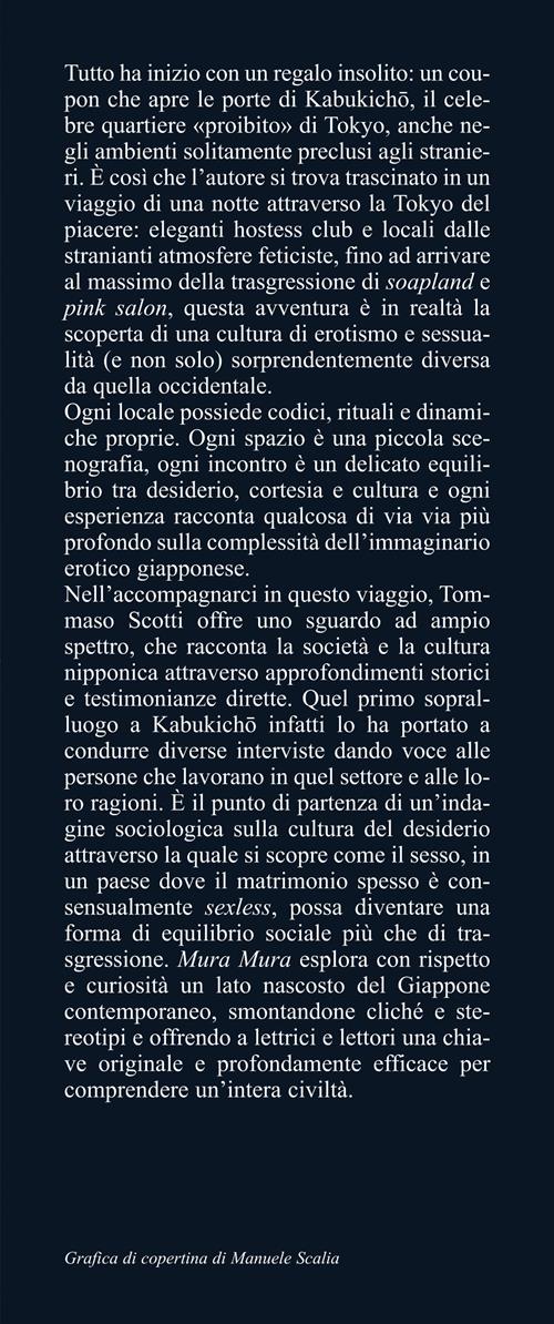Tutto ha inizio con un regalo insolito: un coupon che apre le porte di Kabukicho, il celebre quartiere «proibito» di Tokyo, anche negli ambienti solitamente preclusi agli stranieri. È così che l’autore si trova trascinato in un viaggio di una notte attraverso la Tokyo del piacere: eleganti hostess club e locali dalle stranianti atmosfere feticiste, fino ad arrivare al massimo della trasgressione di soapland e pink salon, questa avventura è in realtà la scoperta di una cultura di erotismo e sessualità (e non solo) sorprendentemente diversa da quella occidentale.Ogni locale possiede codici, rituali e dinamiche proprie. Ogni spazio è una piccola scenografia, ogni incontro è un delicato equilibrio tra desiderio, cortesia e cultura e ogni esperienza racconta qualcosa di via via più profondo sulla complessità dell’immaginario erotico giapponese. Nell’accompagnarci in questo viaggio, Tommaso Scotti offre uno sguardo ad ampio spettro, che racconta la società e la cultura nipponica attraverso approfondimenti storici e testimonianze dirette. Quel primo sopralluogo a Kabukicho infatti lo ha portato a condurre diverse interviste dando voce alle persone che lavorano in quel settore e alle loro ragioni. È il punto di partenza di un’indagine sociologica sulla cultura del desiderio attraverso la quale si scopre come il sesso, in un paese dove il matrimonio spesso è consensualmente sexless, possa diventare una forma di equilibrio sociale più che di trasgressione.