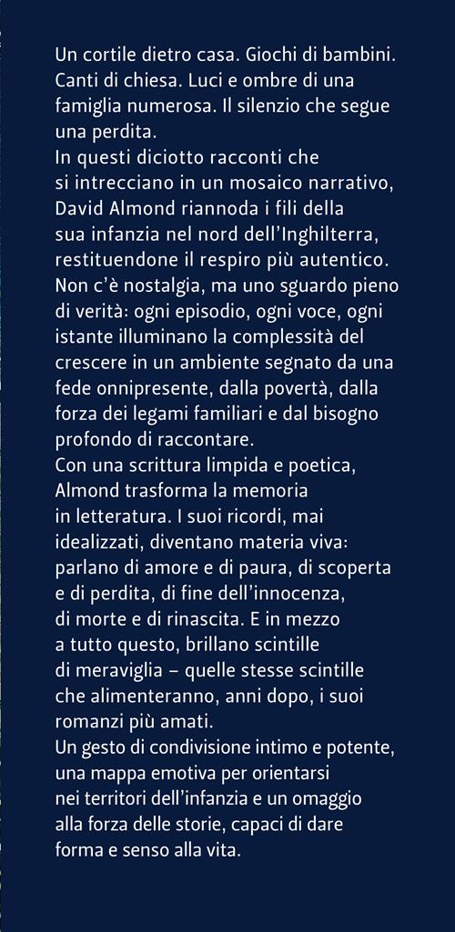 Un viaggio emotivo e narrativo attraverso l'infanzia di David Almond nel nord dell'Inghilterra, terreno fertile per storie che esplorano con intensità e tenerezza temi come gioia, oscurità, amore, morte e identità. Questa raccolta di racconti semi-autobiografici rivela l'ambiente religioso e bigotto della sua crescita, i legami familiari profondi e complessi, e l'influenza di queste esperienze sulle sue opere future. Età di lettura: 10 anni.