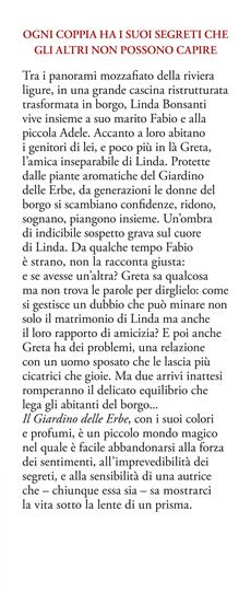Ogni coppia ha i suoi segreti che gli altri non possono capire. Tra i panorami mozzafiato della riviera ligure, in una grande cascina ristrutturata trasformata in borgo, Linda Bonsanti vive insieme a suo marito Fabio e alla piccola Adele. Accanto a loro abitano i genitori di lei, e poco più in là Greta, l'amica inseparabile di Linda. Protette dalle piante aromatiche del Giardino delle Erbe, da generazioni le donne del borgo si scambiano confidenze, ridono, sognano, piangono insieme. Un'ombra di indicibile sospetto grava sul cuore di Linda. Da qualche tempo Fabio è strano, non la racconta giusta: e se avesse un'altra? Greta sa qualcosa ma non trova le parole per dirglielo: come si gestisce un dubbio che può minare non solo il matrimonio di Linda ma anche il loro rapporto di amicizia? E poi anche Greta ha dei problemi, una relazione con un uomo sposato che le lascia più cicatrici che gioie. Ma due arrivi inattesi romperanno il delicato equilibrio che lega gli abitanti del borgo... Il Giardino delle Erbe, con i suoi colori e profumi, è un piccolo mondo magico nel quale è facile abbandonarsi alla forza dei sentimenti, all'imprevedibilità dei segreti, e alla sensibilità di una autrice che – chiunque essa sia – sa mostrarci la vita sotto la lente di un prisma.