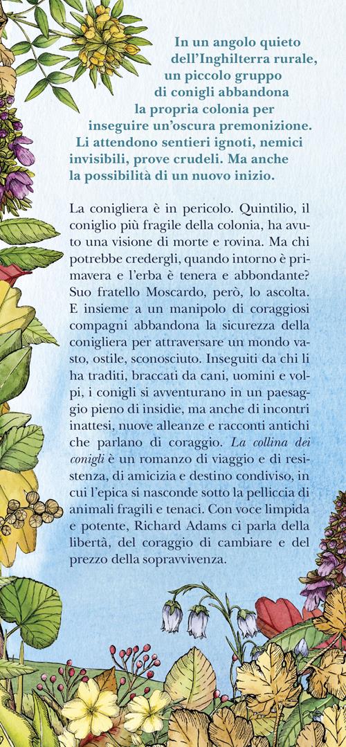 In un angolo quieto dell'Inghilterra rurale, un piccolo gruppo di conigli abbandona la propria colonia per inseguire un'oscura premonizione. Li attendono sentieri ignoti, nemici invisibili, prove crudeli. Ma anche la possibilità di un nuovo inizio. La conigliera è in pericolo. Quintilio, il coniglio più fragile della colonia, ha avuto una visione di morte e rovina. Ma chi potrebbe credergli, quando intorno è primavera e l'erba è tenera e abbondante? Suo fratello Moscardo, però, lo ascolta. E insieme a un manipolo di coraggiosi compagni abbandona la sicurezza della conigliera per attraversare un mondo vasto, ostile, sconosciuto. Inseguiti da chi li ha traditi, braccati da cani, uomini e volpi, i conigli si avventurano in un paesaggio pieno di insidie, ma anche di incontri inattesi, nuove alleanze e racconti antichi che parlano di coraggio. Età di lettura: da 10 anni.
