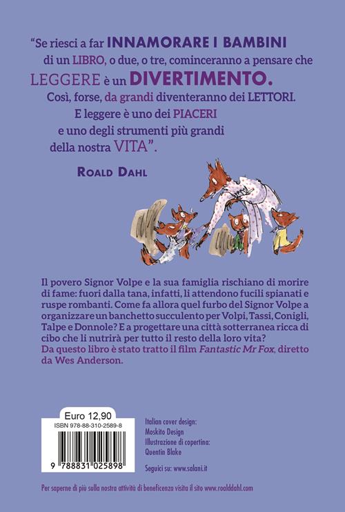 Il povero signor Volpe e la sua famiglia rischiano di morire di fame: fuori dalla tana infatti li attendono fucili spianati e e ruspe rombanti. Come fa allora quel furbo del signor Volpe a organizzare un banchetto succulento per Volpi, Conigli, Tassi, Talpe e Donnole? E a progettare una città sotterranea ricca di cibo che li nutrirà per tutto il resto della loro vita? Età di lettura: da 7 anni.