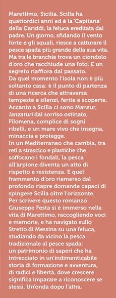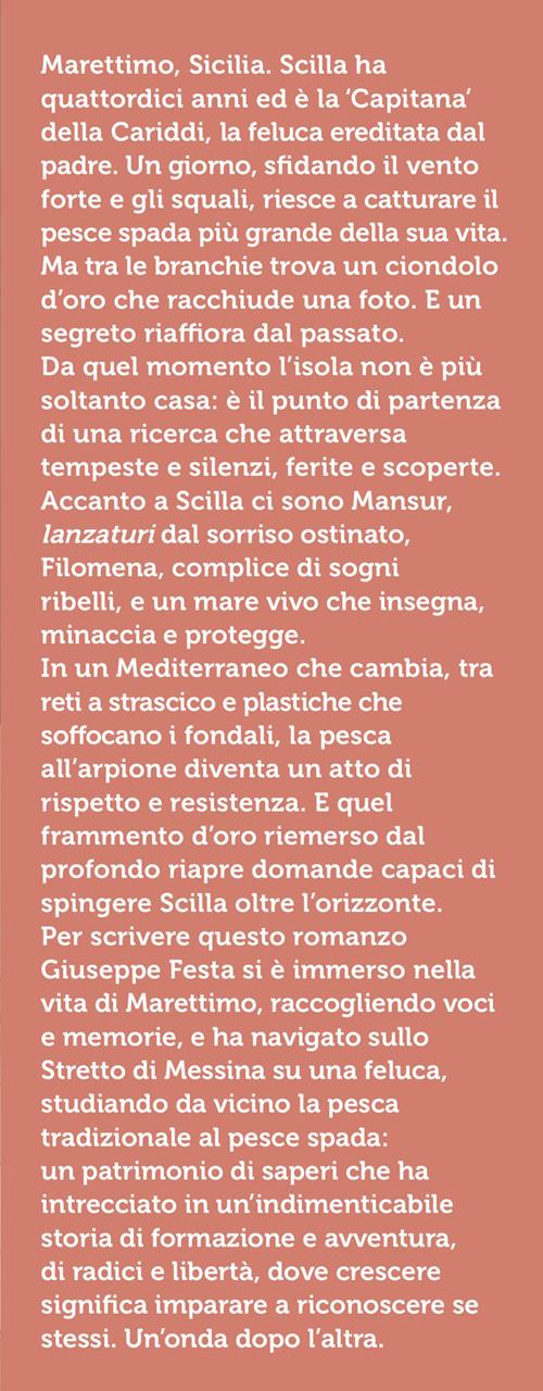 Marettimo, Sicilia. Scilla ha quattordici anni ed è la ‘Capitana' della Cariddi, la feluca ereditata dal padre. Un giorno, sfidando il vento forte e gli squali, riesce a catturare il pesce spada più grande della sua vita. Ma tra le branchie trova un ciondolo d'oro che racchiude una foto. E un segreto riaffiora dal passato. Da quel momento l'isola non è più soltanto casa: è il punto di partenza di una ricerca che attraversa tempeste e silenzi, ferite e scoperte. Accanto a Scilla ci sono Mansur, lanzaturi dal sorriso ostinato, Filomena, complice di sogni ribelli, e un mare vivo che insegna, minaccia e protegge. In un Mediterraneo che cambia, tra reti a strascico e plastiche che soffocano i fondali, la pesca all'arpione diventa un atto di rispetto e resistenza. E quel frammento d'oro riemerso dal profondo riapre domande capaci di spingere Scilla oltre l'orizzonte. Per scrivere questo romanzo Giuseppe Festa si è immerso nella vita di Marettimo, raccogliendo voci e memorie, e ha navigato sullo Stretto di Messina su una feluca, studiando da vicino la pesca tradizionale al pesce spada: un patrimonio di saperi che ha intrecciato in un'indimenticabile storia di formazione e avventura, di radici e libertà, dove crescere significa imparare a riconoscere sé stessi. Un'onda dopo l'altra. Età di lettura: da 12 anni.