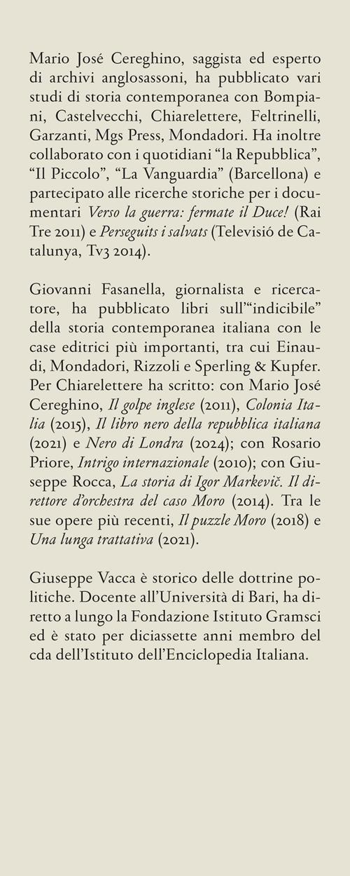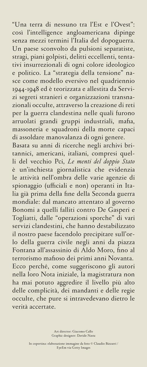 “Una terra di nessuno tra l’Est e l’Ovest”: così l’intelligence angloamericana dipinge senza mezzi termini l’Italia del dopoguerra. Un paese sconvolto da pulsioni separatiste, stragi, piani golpisti, delitti eccellenti, tentativi insurrezionali di ogni colore ideologico e politico. La “strategia della tensione” nasce come modello eversivo nel quadriennio 1944-1948 ed è teorizzata e allestita da Servizi segreti stranieri e organizzazioni transnazionali occulte, attraverso la creazione di reti per la guerra clandestina nelle quali furono arruolati grandi gruppi industriali, mafia, massoneria e squadroni della morte capaci di assoldare manovalanza di ogni genere. Basata su anni di ricerche negli archivi britannici, americani, italiani, compresi quelli del vecchio Pci, "Le menti del doppio Stato" è un’inchiesta giornalistica che evidenzia le attività nell’ombra delle varie agenzie di spionaggio (ufficiali e non) operanti in Italia già prima della fine della Seconda guerra mondiale: dal mancato attentato al governo Bonomi a quelli falliti contro De Gasperi e Togliatti, dalle “operazioni sporche” di vari Servizi clandestini, che hanno destabilizzato il nostro paese facendolo precipitare sull’orlo della guerra civile negli anni da piazza Fontana all’assassinio di Aldo Moro, fino al terrorismo mafioso dei primi anni Novanta. Ecco perché, come suggeriscono gli autori nella loro Nota iniziale, la magistratura non ha mai potuto aggredire il livello più alto delle complicità, dei mandanti e delle regie occulte, che pure si intravedevano dietro le verità accertate. Prefazione di Giuseppe Vacca.