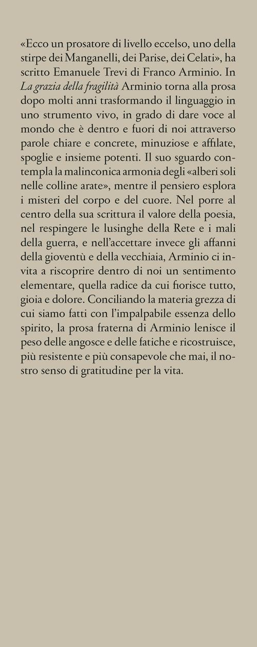 In "La grazia della fragilità" Arminio torna alla prosa dopo molti anni trasformando il linguaggio in uno strumento vivo, in grado di dare voce al mondo che è dentro e fuori di noi attraverso parole chiare e concrete, minuziose e affilate, spoglie e insieme potenti. Il suo sguardo contempla la malinconica armonia degli «alberi soli nelle colline arate», mentre il pensiero esplora i misteri del corpo e del cuore. Nel porre al centro della sua scrittura il valore della poesia, nel respingere le lusinghe della Rete e i mali della guerra, e nell'accettare invece gli affanni della gioventù e della vecchiaia, Arminio ci invita a riscoprire dentro di noi un sentimento elementare, quella radice da cui fiorisce tutto, gioia e dolore. Conciliando la materia grezza di cui siamo fatti con l'impalpabile essenza dello spirito, la prosa fraterna di Arminio lenisce il peso delle angosce e delle fatiche e ricostruisce, più resistente e più consapevole che mai, il nostro senso di gratitudine per la vita.