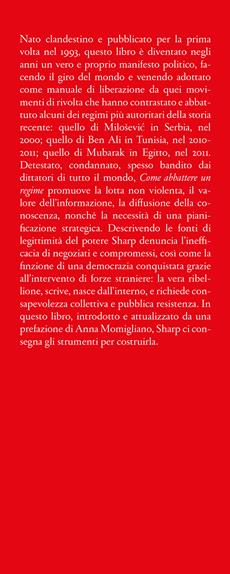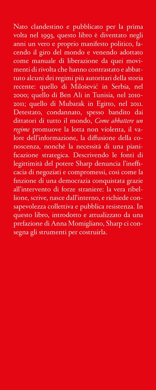 Nato clandestino e pubblicato per la prima volta nel 1993, questo libro è diventato negli anni un vero e proprio manifesto politico, facendo il giro del mondo e venendo adottato come manuale di liberazione da quei movimenti di rivolta che hanno contrastato e abbattuto alcuni dei regimi più autoritari della storia recente: quello di Miloševic in Serbia, nel 2000; quello di Ben Ali in Tunisia, nel 2010-2011; quello di Mubarak in Egitto, nel 2011. Detestato, condannato, spesso bandito dai dittatori di tutto il mondo, Come abbattere un regime promuove la lotta non violenta, il valore dell'informazione, la diffusione della conoscenza, nonché la necessità di una pianificazione strategica. Descrivendo le fonti di legittimità del potere Sharp denuncia l'inefficacia di negoziati e compromessi, così come la finzione di una democrazia conquistata grazie all'intervento di forze straniere: la vera ribellione, scrive, nasce dall'interno, e richiede consapevolezza collettiva e pubblica resistenza. In questo libro, introdotto e attualizzato da una prefazione di Anna Momigliano, Sharp ci consegna gli strumenti per costruirla.