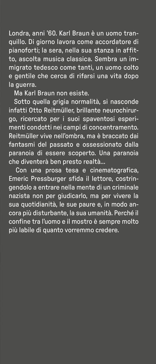 Londra, anni '60. Karl Braun è un uomo tranquillo. Di giorno lavora come accordatore di pianoforti; la sera, nella sua stanza in affitto, ascolta musica classica. Sembra un immigrato tedesco come tanti, un uomo colto e gentile che cerca di rifarsi una vita dopo la guerra. Ma Karl Braun non esiste. Sotto quella grigia normalità, si nasconde infatti Otto Reitmüller, brillante neurochirurgo, ricercato per i suoi spaventosi esperimenti condotti nei campi di concentramento. Reitmüller vive nell'ombra, ma è braccato dai fantasmi del passato e ossessionato dalla paranoia di essere scoperto. Una paranoia che diventerà ben presto realtà… Con una prosa tesa e cinematografica, Emeric Pressburger sfida il lettore, costringendolo a entrare nella mente di un criminale nazista non per giudicarlo, ma per vivere la sua quotidianità, le sue paure e, in modo ancora più disturbante, la sua umanità. Perché il confine tra l'uomo e il mostro è sempre molto più labile di quanto vorremmo credere.