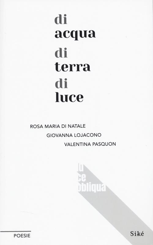 Questo primo libretto, di una collana che si chiama “Luce obliqua”, contiene tre pillole di bellezza, preparate da tre speziali, donne, un po’ maghe e un po’ scienziate. Pensate a questo libretto come a uno di quei ricettari segreti, che circolavano di nascosto, tra il Cinque e il Seicento, scritti da donne o per le donne, che contenevano in una pagina il rimedio per il mal di stomaco e in quella accanto la ricetta di un potentissimo filtro d’amore. Sì, pensate a un libro così, in cui la potenza terrigena che aggruma montagne si disperde sconfitta dall’ancestrale eco dell’acqua che lava ogni segno che è stato. Per questo primo numero di “Luce obliqua”, abbiamo deciso di scegliere alcune poesie di tre autrici, geograficamente e poeticamente distanti, ma accomunate dal richiamo degli elementi: acqua, terra, aria. I loro testi raccontano la vita che a questi elementi è da sempre connessa, che da essi nasce, che di essi si nutre, che in essi si risolve. Prefazione di Daniela De Liso.
