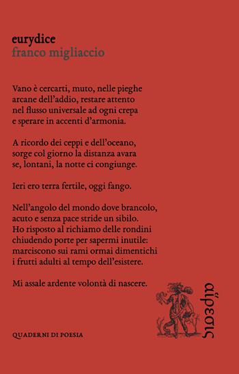 Eurydice è un viaggio attraverso il tentativo dell'uomo di entrare in contatto con la propria anima non rinunciando alla vita terrena grazie alla funzione conoscitiva dell'arte e della poesia. È un percorso che si innesta sul "mito dei miti", la vicenda del poeta Orfeo e di sua moglie Euridice. È il racconto, piuttosto che dell'amore e della perdita o della sfida alla morte, del cammino di autoconoscenza che l'anima intraprende quando si innamora, "servendosi" dell'amato come specchio che rifletta la sua stessa profondità e che consenta il "salto nell'abisso" dietro la garanzia che l'altro non ci lascerà affondare senza ritorno.