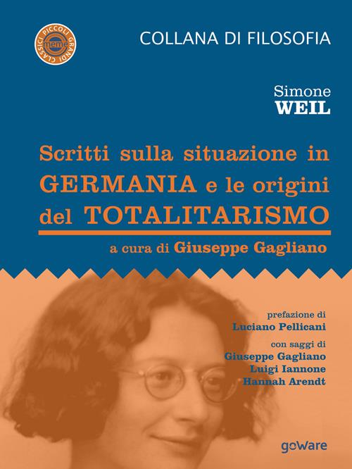 Difficile sottovalutare l’importanza delle riflessioni di Simone Weil per pensare il presente. Testimone di avvenimenti della nostra epoca crudeli e cruciali, li ha sofferti, elaborati e descritti, proprio mentre accadevano, con una lucidità e una sensibilità, forse, inarrivabili. Per questo motivo, a due terzi di secolo dalla sua prematura scomparsa, si continua a leggere, studiare, ammirare il pensiero della giovane parigina e a trarne ispirazione. La sua analisi delle origini del totalitarismo e della sua affermazione in Germania mette in luce le straordinarie affinità tra il nazismo e l’Impero romano, che Weil considera la vera e propria scuola del totalitarismo. Una scuola che ha nutrito tutte le successive esperienze, incluso il bolscevismo. Oltre al saggio di Weil sulla situazione tedesca, scritto alla vigilia della guerra e adattato da Gagliano per il lettore italiano, questo volume passa in rassegna le più importanti teorie sul totalitarismo, compreso il contributo decisivo di Hannah Arendt sullo Stato totalitario. In un tempo come il nostro, queste letture possono contribuire a comprendere ciò che sta accadendo intorno a noi. Prefazione di Luciano Pellicani e saggi di Giuseppe Gagliano, Luigi Iannone, Hannah Arendt.