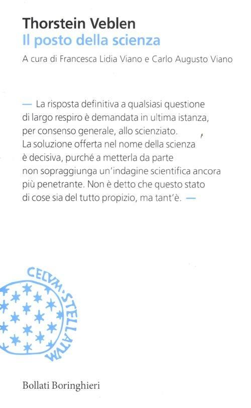 Qual è il ruolo della scienza nella società contemporanea? Questa domanda ritorna periodicamente nel dibattito pubblico, che si parli di biotecnologie, di fisica nucleare o di matematica finanziaria. Si tratta di una domanda antica, che ha spesso diviso il mondo tra fautori e detrattori del pensiero scientifico e che nel nostro paese, in particolare, ha visto la forte contrapposizione tra un fronte idealista e religioso da un lato e uno positivista e pragmatista dall'altro. È sorprendente dunque che in un dibattito così serrato non siano mai stati pubblicati in italiano i due contributi cruciali che proponiamo in questo volume, scritti da Thorstein Veblen tra il 1906 e il 1908, nel contesto tumultuoso della seconda industrializzazione. Oggi questo libro svela un Veblen inedito, non economista ma epistemologo, il cui acume ha ancora molto da insegnarci.