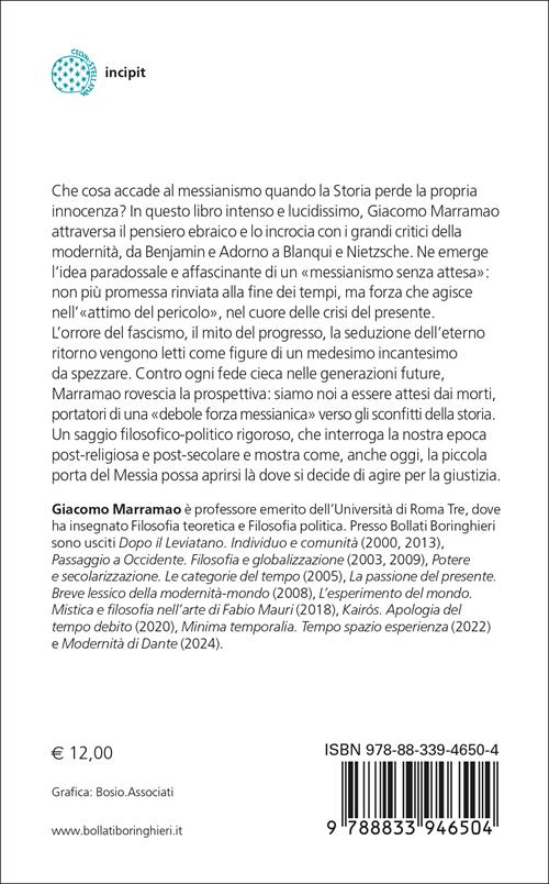Che cosa accade al messianismo quando la Storia perde la propria innocenza? In questo libro intenso e lucidissimo, Giacomo Marramao attraversa il pensiero ebraico e lo incrocia con i grandi critici della modernità, da Benjamin e Adorno a Blanqui e Nietzsche. Ne emerge l’idea paradossale e affascinante di un «messianismo senza attesa»: non più promessa rinviata alla fine dei tempi, ma forza che agisce nell’«attimo del pericolo», nel cuore delle crisi del presente. L’orrore del fascismo, il mito del progresso, la seduzione dell’eterno ritorno vengono letti come figure di un medesimo incantesimo da spezzare. Contro ogni fede cieca nelle generazioni future, Marramao rovescia la prospettiva: siamo noi a essere attesi dai morti, portatori di una «debole forza messianica» verso gli sconfitti della storia.