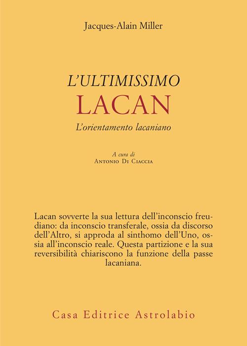 Negli ultimi anni di vita, Lacan apporta alla sua lettura dell’inconscio freudiano cambiamenti che sconvolgono e in un certo senso sembrano contraddire tutto il suo precedente insegnamento. L’ultimissimo insegnamento di Lacan inizia con il Seminario XXIII del 1975-1976, in cui lo psicoanalista si affida a James Joyce come suo Virgilio, e prosegue nei Seminari successivi, per terminare con il cosiddetto Seminario di Caracas, dell’agosto del 1980, un anno prima della sua morte. È di questa svolta che tratta Jacques-Alain Miller nel Corso L’ultimissimo Lacan, all’interno del ciclo “L’orientamento lacaniano”, introducendo la differenza tra l’inconscio transferale e l’inconscio reale, il quale non è più indirizzato all’Altro, ma emerge sullo sfondo di una solitudine totale del soggetto. L’inconscio non è più il discorso dell’Altro, ma il monologo dell’Uno-tutto-solo, e il sintomo, che era la manifestazione dell’inconscio in attesa di una qualche interpretazione, è ormai sinthomo. Ossia, come avvenne per Joyce, è la consistenza assolutamente singolare del soggetto e tuttavia è indecifrabile, poiché non è dell’ordine della cifra, ma dell’ordine dell’uso: al soggetto, come a Joyce, non resta che servirsene e farne buon uso.