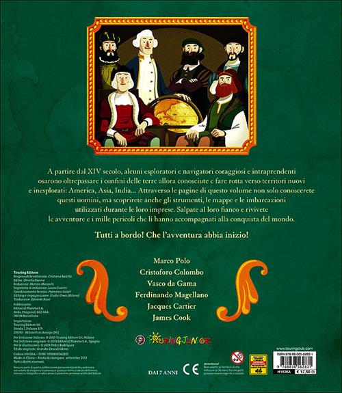 A partire dal XIV secolo, alcuni esploratori e navigatori coraggiosi e intraprendenti osarono oltrepassare i confini delle terre allora conosciute e fare rotta verso territori nuovi e inesplorati: America, Asia, India... Attraverso le pagine di questo volume non solo conoscerete questi uomini, ma scoprirete anche gli strumenti, le mappe e le imbarcazioni utilizzati durante le loro imprese. Salpate al loro fianco e rivivete le avventure e i mille pericoli che li hanno accompagnati alla conquista del mondo. Tutti a bordo! Che l'avventura abbia inizio. Età di lettura: da 8 anni.