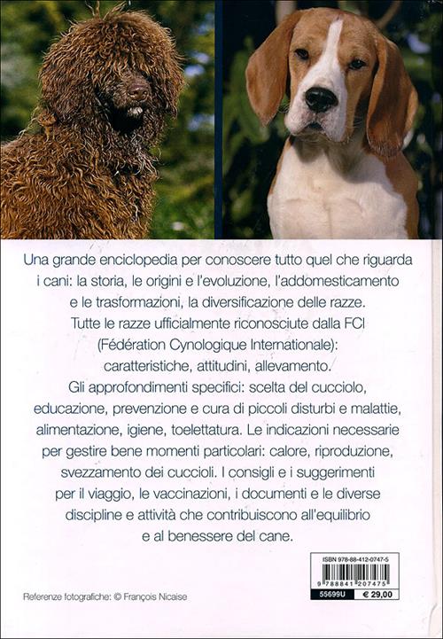 Una grande enciclopedia per conoscere tutto ciò che riguarda i cani: le origini, l'evoluzione e la storia; la selezione e l'addomesticamento; la diversificazione delle razze, le finalità e gli impieghi professionali e ludici. Tutte le razze ufficialmente riconosciute e classificate dalla Federazione Cinologica Internazionale: caratteristiche fisiche e comportamentali, attitudini, particolarità. Gli approfondimenti per la scelta di un cucciolo, l'allevamento, la prima educazione, la prevenzione di disturbi e malattie, la toelettatura, l'alimentazione.