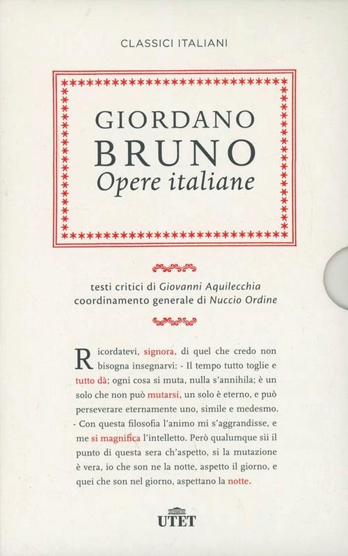 Figura di grande rilievo per l’Italia e l’Europa della seconda metà del 1500, Giordano Bruno è passato alla storia come filosofo e scrittore, dopo essere stato anche frate domenicano. Le sue Opere italiane, edite in due volumi da UTET con i testi critici di Giovanni Aquilecchia, vengono dopo quelle parigine e londinesi e oggi si trovano disponibili anche in formato ebook, sempre per UTET e sempre con un compendio critico di inestimabile valore.