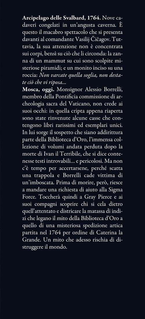 Arcipelago delle Svalbard, 1764. Nove cadaveri congelati in un'angusta caverna. È questo il macabro spettacolo che si presenta davanti al comandante Vasilij Čičagov. Tuttavia, la sua attenzione non è concentrata sui corpi, bensì su ciò che li circonda: la zanna di un mammut su cui sono scolpite misteriose piramidi; e un monito inciso su una roccia: Non varcate quella soglia, non destate ciò che vi riposa… Mosca, oggi. Monsignor Alessio Borrelli, membro della Pontificia commissione di archeologia sacra del Vaticano, non crede ai suoi occhi: in quella cripta appena riaperta sono state rinvenute alcune casse che contengono libri rarissimi ed esemplari unici. In lui sorge il sospetto che siano addirittura parte della Biblioteca d'Oro, l'immensa collezione di volumi andata perduta dopo la morte di Ivan il Terribile, che si dice contenesse testi introvabili… e pericolosi. Ma non c'è tempo per accertarsene, perché scatta una trappola e Borrelli cade vittima di un'imboscata. Prima di morire, però, riesce a mandare una richiesta di aiuto alla Sigma Force. Toccherà quindi a Gray Pierce e ai suoi compagni scoprire chi si cela dietro quell'attentato e districare la matassa di indizi che legano il mito della Biblioteca d'Oro a quello di una misteriosa spedizione artica partita nel 1764 per ordine di Caterina la Grande. Un mito che adesso rischia di distruggere il mondo.