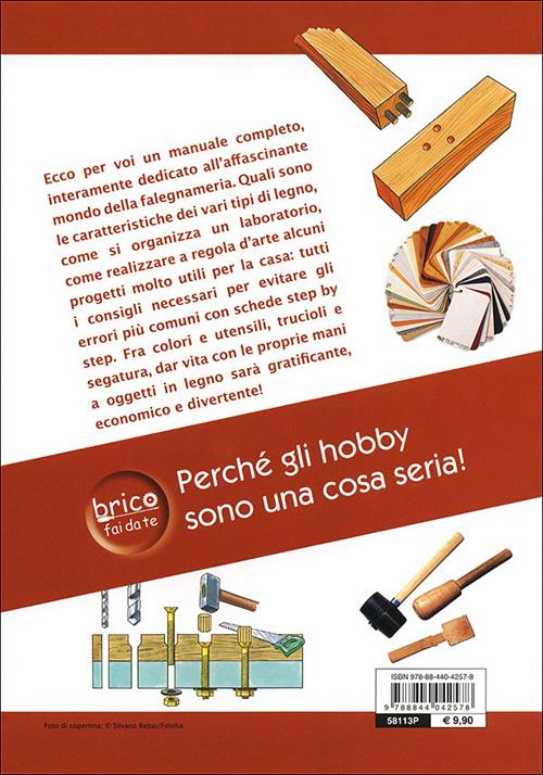 Tutto quanto deve sapere chi ha la passione della falegnameria. Come attrezzare un piccolo laboratorio domestico, luminoso e funzionale, con strumenti di base e altri specifici come compassi, morse, scalpelli, seghe; come eseguire lavorazioni di base e riparazioni, assemblare, verniciare, fino alla realizzazione di interi progetti di mensole, cassapanche, scaffali: un vero banco di prova della vostra abilità.
