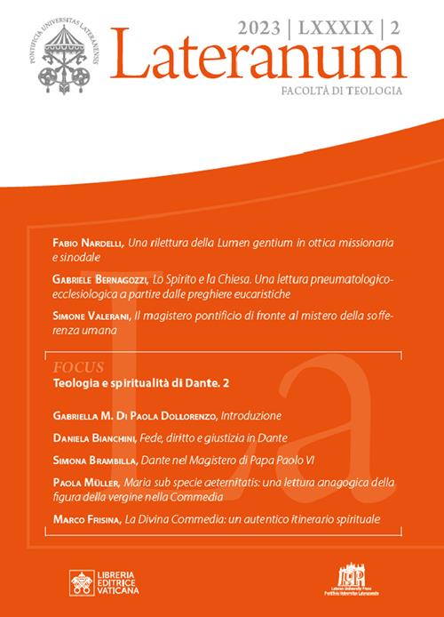 Fabio Nardelli, Una rilettura della Lumen gentium in ottica missionaria e sinodale; Gabriele Bernagozzi, Lo Spirito e la Chiesa. Una lettura pneumatologico-ecclesiologica a partire dalle preghiere eucaristiche; Simone Valerani, Il magistero pontificio di fronte al mistero della sofferenza umana Focus Teologia e spiritualità di Dante. 2 Gabriella M. Di Paola Dollorenzo, Introduzione; Daniela Bianchini, Fede, diritto e giustizia in Dante; Simona Brambilla, Dante nel Magistero di Papa Paolo VI; Paola Müller, Maria sub specie aeternitatis: una lettura anagogica della figura della vergine nella Commedia; Marco Frisina, La Divina Commedia: un autentico itinerario spirituale.