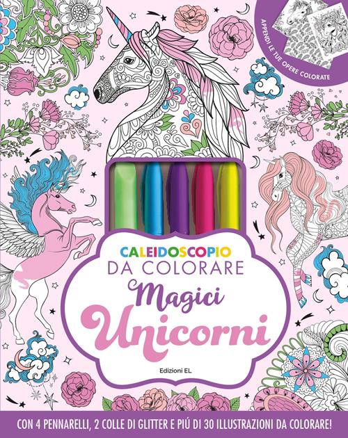 Caleidoscopio da colorare. Magici unicorni. Ediz. illustrata. Con 2 colle glitterate. Con 4 pennarelli