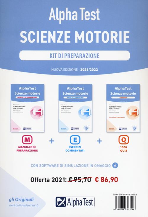 L'edizione 2021/2022 di questo kit è una soluzione completa e aggiornata per la tua preparazione ai test di ammissione a Scienze motorie e dello Sport, valido anche per il corso dell'Università Cattolica. Ogni libro prevede la trattazione di tutti gli argomenti oggetto d'esame: logica, cultura generale, biologia, chimica, fisica, matematica e sport. Il kit comprende: il manuale, con la teoria essenziale per studiare o ripassare ogni argomento richiesto al test; un eserciziario con i commenti per mettersi alla prova e chiarire ogni dubbio; una raccolta di migliaia di domande ufficiali suddivise per materia con tutte le soluzioni. Il software Alpha Test Player permette di svolgere infinite esercitazioni e prove simulate secondo le modalità dell'esame ufficiale, attingendo sia dai quesiti commentati dell'eserciziario sia dal ricco archivio della raccolta di quiz. I risultati sono immediatamente disponibili e vengono presentati anche in forma grafica.