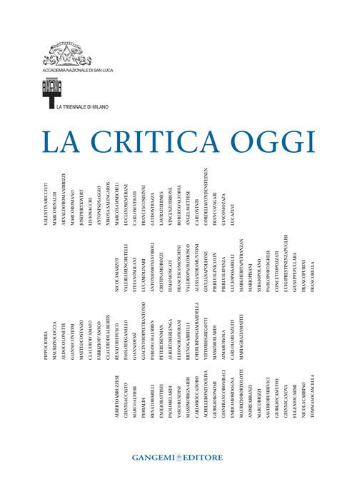 Il convegno nazionale "La Critica oggi", promosso e voluto dall'Accademia Nazionale di San Luca in collaborazione con la Triennale di Milano, è l'occasione di un confronto concreto sul ruolo della critica nei vari ambiti culturali: arte, architettura, letteratura, media, design, cinema, musica, teatro, moda e fotografia. È articolato in due sessioni, ciascuna composta da una giornata - la prima a Roma, nella sede dell'Accademia Nazionale di San Luca, la seconda alla Triennale di Milano - in cui sono stati invitati ad intervenire storici, architetti, filosofi, scrittori, critici d'arte, artisti, curatori di eventi, sociologi, per discutere e approfondire un concetto della critica che è in continua metamorfosi. Il convegno pone le basi su una serie di riflessioni di studiosi italiani e stranieri che sono state raccolte anticipatamente in un volume, un documento completamente inedito sulla critica contemporanea che contribuisce, non solo fare il punto della situazione attuale, ma soprattutto ne fa ripartire la discussione e ne ridefinisce il concetto.