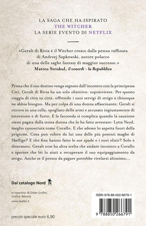 Scopri il sito dedicato al mondo di Andrzej Sapkowski. La saga che ha ispirato The witcher la serie evento di Netflix. La guerra con l'impero di Nilfgaard è ormai finita, eppure il poeta Ranuncolo ha ancora molte storie da raccontare. E allora prende in mano il liuto e ricomincia a cantare le avventure di Geralt di Rivia... Prima che il suo destino venga segnato dall'incontro con la principessa Cirilla, Geralt di Rivia ha un solo obiettivo: sopravvivere. Per questo viaggia di città in città, offrendo i suoi servigi di strigo a chiunque ne abbia bisogno. Che si tratti di spiriti maligni, ghul o volpi mutaforma, Geralt è sempre pronto a combattere, soprattutto se c'è la possibilità di guadagnare qualche moneta. Il suo è un mestiere rischioso, eppure nessun mostro si è mai rivelato infido e spietato quanto la peggiore di tutte le creature: l'uomo. Infatti è per colpa di un'umana se Geralt si ritrova in una cella, spogliato delle armi e accusato ingiustamente di estorsione e di furto. E la faccenda si complica quando la cauzione viene pagata dalla stessa, affascinante donna che lo ha fatto arrestare: Lytta Neyd, meglio conosciuta come Corallo. E che adesso lo aspetta fuori della prigione. Cosa può volere da lui una delle più potenti maghe di Skellige? E che fine hanno fatto le sue spade e i suoi elisir, scomparsi dal deposito del carcere? Solo e disarmato, Geralt non ha altra scelta che andare incontro a Corallo e sperare che lei lo aiuti a recuperare il suo equipaggiamento da strigo. Anche se il prezzo da pagare potrebbe rivelarsi altissimo.... La saga di The Witcher: "Il guardiano degli innocenti"; "La spada del destino"; "Il Sangue degli Elfi"; "Il tempo della guerra"; "Il battesimo del fuoco"; "La Torre della Rondine"; "La Signora del Lago"; "La stagione delle tempeste".