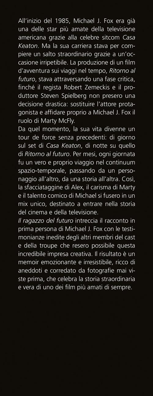 A 40 anni da "Ritorno al futuro", Micheal J. Fox torna in libreria con un libro che svela i dietro le quinte della pellicola che ha reso immortale l'indimenticabile personaggio di Marty McFly. All'inizio del 1985, Michael J. Fox era già una delle star più amate della televisione americana grazie alla celebre sitcom "Casa Keaton". Ma la sua carriera stava per compiere un salto straordinario grazie a un'occasione irripetibile. La produzione di un film d'avventura sui viaggi nel tempo, "Ritorno al futuro", stava attraversando una fase critica, finché il regista Robert Zemeckis e il produttore Steven Spielberg non presero una decisione drastica: sostituire l'attore protagonista e affidare proprio a Michael J. Fox il ruolo di Marty McFly. Da quel momento, la sua vita divenne un tour de force senza precedenti: di giorno sul set di "Casa Keaton", di notte su quello di Ritorno al futuro. Per mesi, ogni giornata fu un vero e proprio viaggio nel continuum spazio-temporale, passando da un personaggio all'altro, da una storia all'altra. Così, la sfacciataggine di Alex, il carisma di Marty e il talento comico di Michael si fusero in un mix unico, destinato a entrare nella storia del cinema e della televisione. Il ragazzo del futuro intreccia il racconto in prima persona di Michael J. Fox con testimonianze inedite degli altri membri del cast e della troupe che resero possibile questa incredibile impresa creativa. Il risultato è un memoir emozionante e irresistibile, ricco di aneddoti e arricchito da 60 fotografie mai viste prima, che celebra la storia straordinaria – e vera – di uno dei film più amati di sempre.