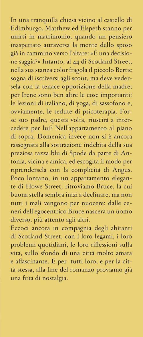In una tranquilla chiesa vicino al castello di Edimburgo, Matthew ed Elspeth stanno per unirsi in matrimonio, quando un pensiero inaspettato attraversa la mente dello sposo già in cammino verso l'altare: «È una decisione saggia?» Intanto, al 44 di Scotland Street, nella sua stanza color fragola il piccolo Bertie sogna di iscriversi agli scout, ma deve vedersela con la tenace opposizione della madre; per Irene sono ben altre le cose importanti: le lezioni di italiano, di yoga, di sassofono e, ovviamente, le sedute di psicoterapia. Forse suo padre, questa volta, riuscirà a intercedere per lui? Nell'appartamento al piano di sopra, Domenica invece non si è ancora rassegnata alla sottrazione indebita della sua preziosa tazza blu di Spode da parte di Antonia, vicina e amica, ed escogita il modo per riprendersela con la complicità di Angus. Poco lontano, in un appartamento elegante di Howe Street, ritroviamo Bruce, la cui buona stella sembra inizi a declinare, ma non tutti i mali vengono per nuocere: dalle ceneri dell'egocentrico Bruce nascerà un uomo diverso, più attento agli altri. Eccoci ancora in compagnia degli abitanti di Scotland Street, con i loro legami, i loro problemi quotidiani, le loro riflessioni sulla vita, sullo sfondo di una città molto amata e affascinante. E per tutti loro, e per la città stessa. alla fine del romanzo proviamo già una fitta di nostalgia. "L'insostenibile leggerezza degli scone" è la 5a storia del 44 Scotland Street, ma può essere letta e apprezzata indipendentemente dall'ordine della serie.