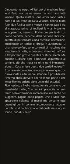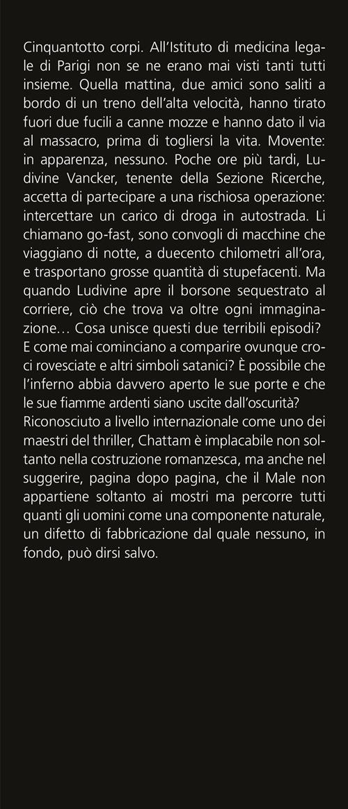 Quando il diavolo apre le danze, il mondo impazzisce. Cinquantotto corpi. All'Istituto di medicina legale di Parigi non se ne erano mai visti tanti tutti insieme. Quella mattina, due amici sono saliti a bordo di un treno dell'alta velocità, hanno tirato fuori due fucili a canne mozze e hanno dato il via al massacro, prima di togliersi la vita. Movente: in apparenza, nessuno. Poche ore più tardi, Ludivine Vancker, tenente della Sezione Ricerche, accetta di partecipare a una rischiosa operazione: intercettare un carico di droga in autostrada. Li chiamano go-fast, sono convogli di macchine che viaggiano di notte, a duecento chilometri all'ora, e trasportano grosse quantità di stupefacenti. Ma quando Ludivine apre il borsone sequestrato al corriere, ciò che trova va oltre ogni immaginazione… Cosa unisce questi due terribili episodi? E come mai cominciano a comparire ovunque croci rovesciate e altri simboli satanici? È possibile che l'inferno abbia davvero aperto le sue porte e che le sue fiamme ardenti siano uscite dall'oscurità? Riconosciuto a livello internazionale come uno dei maestri del thriller, Chattam è implacabile non soltanto nella costruzione romanzesca, ma anche nel suggerire, pagina dopo pagina, che il Male non appartiene soltanto ai mostri ma percorre tutti quanti gli uomini come una componente naturale, un difetto di fabbricazione dal quale nessuno, in fondo, può dirsi salvo.