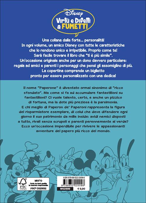 Un ricco volume che raccoglie una selezione di storie a fumetti nelle quali una virtù o un simpatico difetto, caratteristico di uno dei personaggi Disney, viene messo in particolare risalto. In questo volume sono raccolte le avventure del plurimiliardario Zio Paperone, in cui la sua capacità di risparmiare si esprime al meglio. Età di lettura: da 6 anni.