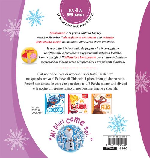 Il titolo "Con te mi sento unico" sottolinea l’importanza di accettare l’unicità dei protagonisti di Frozen, apprezzati proprio in virtù del loro essere speciali. Quella degli Emozionari è una collana nata per favorire l’educazione ai sentimenti e lo sviluppo delle abilità sociali nei bambini attraverso storie illustrate. Il racconto, intervallato da pagine “di sospensione”, che incoraggiano la riflessione e forniscono suggerimenti semplici sul tema trattato, li aiuta a comprendere i propri stati d’animo e dare un nome ai sentimenti. Con l’ABC dei sentimenti che approfondisce il tema del titolo, e i consigli dell’Allenatore Emozionale per la famiglia. Età di lettura: da 5 anni.