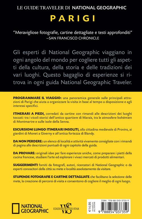 Programmare il viaggio, una panoramica generale sulle principali attrazioni di Parigi che aiuta a organizzare la visita in base al tempo a disposizione e agli interessi specifici. Da provare, pratiche e originali idee per prendere parte a un ballo nella caserma dei pompieri, andare alla scoperta dei mercati rionali e prendere lezioni d'arte en plein air. Suggerimenti forniti da fotografi, autori, ricercatori di National Geographic o da esperti conoscitori della città su mete e località da non perdere, aspetti pratici e molto altro ancora. Itinerari a piedi corredati da cartine con rimandi alle descrizioni dei luoghi toccati, che propongono percorsi tra i vicoli storici dell'antico quartiere di Marais, tra le atmosfere bohémien di Montmartre e sulle isole della Senna. Escursioni fuori città alla cittadina medievale di Provins, ai giardini di Monet a Giverny e all'antica fortezza di Blandy. Da non perdere, un elenco di località e attività vivamente consigliate con i rimandi di pagina alle descrizioni puntuali di ogni capitolo della guida. Stupende fotografie e cartine dettagliate che facilitano la selezione delle mete, la creazione di percorsi di visita e consentono di cogliere il meglio di ogni luogo.