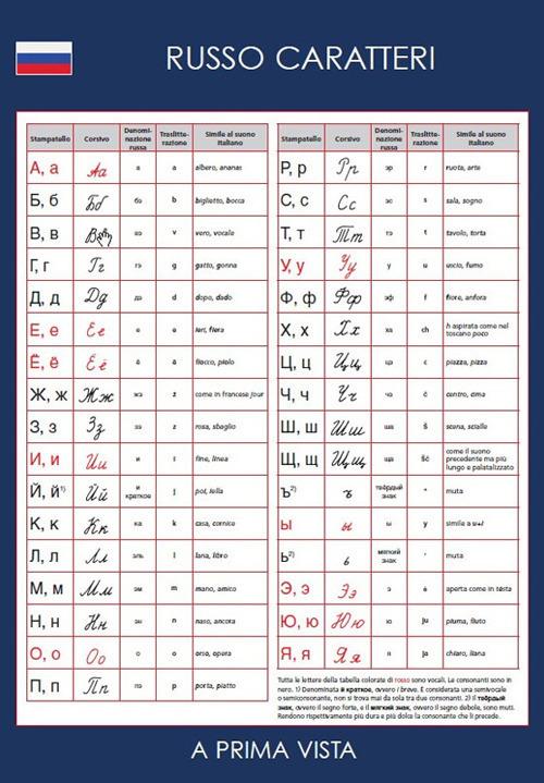 La scheda «A Prima Vista. Russo: caratteri» offre uno strumento pratico ed efficace a chi si affaccia allo studio dell'antico alfabeto cirillico in ambito scolastico, professionale o nel tempo libero. Un'introduzione sulla nascita e lo sviluppo della lingua russa e un approccio comparato con le lingue slave fanno da corredo agli approfondimenti sull'alfabeto e sulla pronuncia insieme alle indicazioni sull'ortografia e sull'utilizzo della lingua con supporti informatici.