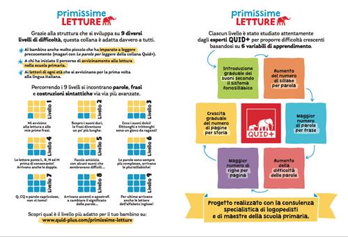 Pietro, Leti e il loro inseparabile amico, l’elefantino rosso Quid, sono gli impareggiabili compagni di viaggio per imparare a leggere in autonomia. La collana utilizza un metodo innovativo, studiato con il supporto di logopedisti e maestre della scuola primaria, strutturato su 9 diversi livelli di difficoltà, in modo da sottoporre al bambino il giusto livello di lettura: né troppo facile da annoiarlo, né troppo difficile da indurlo ad abbandonare l’attività. Grazie al questionario, presente sul sito dedicato quid-plus/primissime-letture, individuare il livello da cui partire è semplice ed immediato. Età di lettura: da 5 anni.