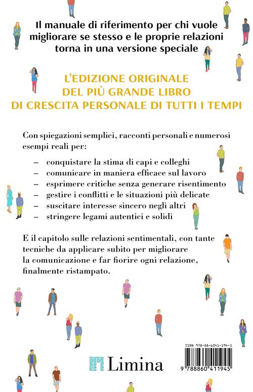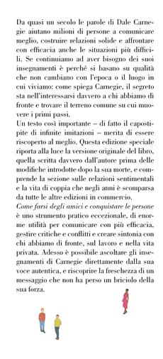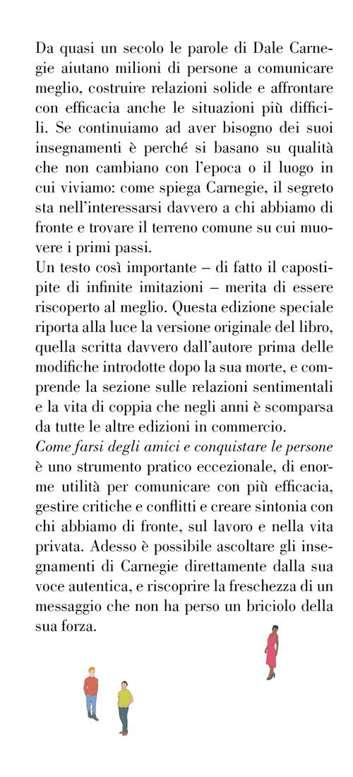 Con un'introduzione di Giorgio Nardone. L'edizione originale del classico che ha ispirato milioni di lettori in tutto il mondo. Il manuale di riferimento per chi vuole migliorare se stesso e le proprie relazioni torna in una versione speciale: l'edizione originale del più grande libro di crescita personale di tutti i tempi. Da quasi un secolo le parole di Dale Carnegie aiutano milioni di persone a comunicare meglio, costruire relazioni solide e affrontare con efficacia anche le situazioni più difficili. Se continuiamo ad aver bisogno dei suoi insegnamenti è perché si basano su qualità che non cambiano con l'epoca o il luogo in cui viviamo: come spiega Carnegie, il segreto sta nell'interessarsi davvero a chi abbiamo di fronte e trovare il terreno comune su cui muovere i primi passi. Un testo così importante – di fatto il capostipite di infinite imitazioni – merita di essere riscoperto al meglio. Questa edizione speciale riporta alla luce la versione originale del libro, quella scritta davvero dall'autore prima delle modifiche introdotte dopo la sua morte, e comprende la sezione sulle relazioni sentimentali e la vita di coppia che negli anni è scomparsa da tutte le altre edizioni in commercio. Come farsi degli amici e conquistare le persone è uno strumento pratico eccezionale, di enorme utilità per comunicare con più efficacia, gestire critiche e conflitti e creare sintonia con chi abbiamo di fronte, sul lavoro e nella vita privata. Adesso è possibile ascoltare gli insegnamenti di Carnegie direttamente dalla sua voce autentica, e riscoprire la freschezza di un messaggio che non ha perso un briciolo della sua forza. Con spiegazioni semplici, racconti personali e numerosi esempi reali per: – conquistare la stima di capi e colleghi – comunicare in maniera efficace sul lavoro – esprimere critiche senza generare risentimento – gestire i conflitti e le situazioni più delicate – suscitare interesse sincero negli altri – stringere legami autentici e solidi E il capitolo sulle relazioni sentimentali, con tante tecniche da applicare subito per migliorare la comunicazione e far fiorire ogni relazione, finalmente ristampato.