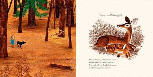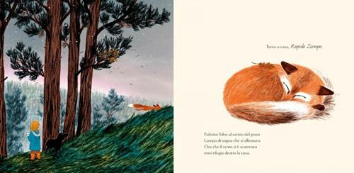 Il sole sta per tramontare, le ombre avvolgono la foresta. L'orso, la lepre, il picchio, la volpe... tutti tornano alle proprie tane. Intanto qualcuno li osserva: una bimba esploratrice che col suo cane passa in rassegna, con affettuosa curiosità, gli abitanti del bosco, per poi tornare anche lei al calduccio di casa.