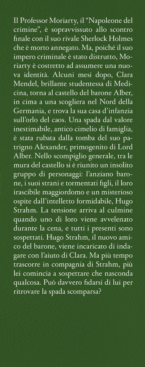 Il professor Moriarty, il “Napoleone del crimine”, è sopravvissuto allo scontro finale con Sherlock Holmes alle Cascate di Reichenbach, dove il rivale è stato inghiottito dalle acque. Disilluso e senza un soldo, dopo che il suo impero criminale è stato distrutto, Moriarty decide di farsi credere morto e assume l’identità del ricco inventore Hugo Strahm. Ma quando gli viene recapitata una lettera che Sherlock Holmes gli ha scritto prima di morire, Moriarty si ritrova a indossare i panni del detective accettando la sfida, postuma, del suo eterno rivale. Quando la studentessa di medicina Clara Mendel torna a Schloss Alber, un castello nel Nord della Germania, trova la sua casa d’infanzia sull’orlo della rovina. Il furto di un cimelio dal valore inestimabile ha gettato la sua famiglia nel caos, e tra le mura del castello si è riunito un insolito gruppo di personaggi: l’ostinato Lord Alber, i suoi strani e tormentati figli, il loro irascibile maggiordomo e un misterioso ospite, Hugo Strahm. Quando un omicidio viene commesso durante una cena in cui tutti i potenziali sospettati sono presenti, Strahm cerca di risolvere il puzzle che il suo più grande sfidante ha lasciato dietro di sé, cercando al contempo di mantenere segreta la sua vera identità. Ma pur indossando i panni del detective, Hugo Strahm non ha alcun interesse per la giustizia…
