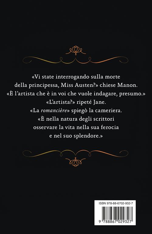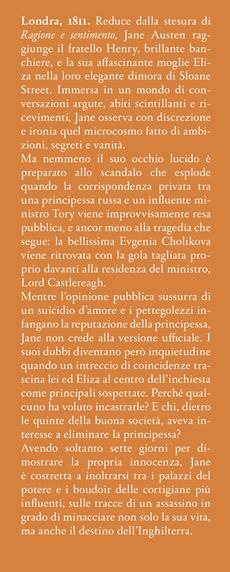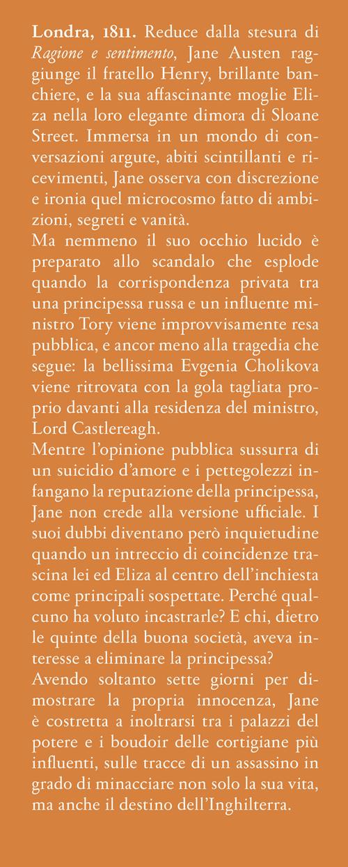 Londra, 1811. Reduce dalla stesura di Ragione e sentimento, Jane Austen raggiunge il fratello Henry, brillante banchiere, e la sua affascinante moglie Eliza nella loro elegante dimora di Sloane Street. Immersa in un mondo di conversazioni argute, abiti scintillanti e ricevimenti, Jane osserva con discrezione e ironia quel microcosmo fatto di ambizioni, segreti e vanità. Ma nemmeno il suo occhio lucido è preparato allo scandalo che esplode quando la corrispondenza privata tra una principessa russa e un influente ministro Tory viene improvvisamente resa pubblica, e ancor meno alla tragedia che segue: la bellissima Evgenia Cholikova viene ritrovata con la gola tagliata proprio davanti alla residenza del ministro, Lord Castlereagh. Mentre l’opinione pubblica sussurra di un suicidio d’amore e i pettegolezzi infangano la reputazione della principessa, Jane non crede alla versione ufficiale. I suoi dubbi diventano però inquietudine quando un intreccio di coincidenze trascina lei ed Eliza al centro dell’inchiesta come principali sospettate. Perché qualcuno ha voluto incastrarle? E chi, dietro le quinte della buona società, aveva interesse a eliminare la principessa? Avendo soltanto sette giorni per dimostrare la propria innocenza, Jane è costretta a inoltrarsi tra i palazzi del potere e i boudoir delle cortigiane più influenti, sulle tracce di un assassino in grado di minacciare non solo la sua vita, ma anche il destino dell’Inghilterra.