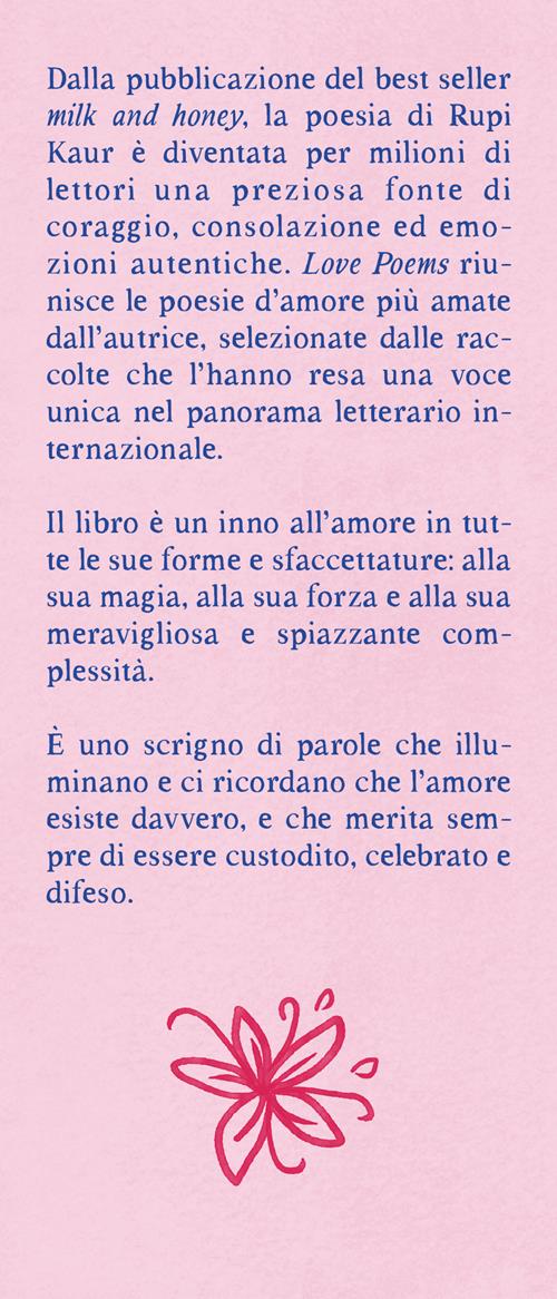 Love Poems riunisce le poesie d'amore più amate dall'autrice, selezionate dalle raccolte che l'hanno resa una voce unica nel panorama letterario internazionale. Il libro è un inno all'amore in tutte le sue forme e sfaccettature: alla sua magia, alla sua forza e alla sua meravigliosa e spiazzante complessità. È un scrigno di parole che illuminano e ci ricordano che l'amore esiste davvero, e che merita sempre di essere custodito, celebrato e difeso. «L'amore è forse l'unica vera magia rimasta al mondo, quella che nessuno può spiegare e che, proprio per questo, non smette d'incantarci».