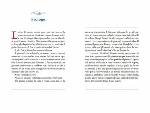 Dopo la Collisione Temporale il mondo è cambiato. I continenti si sono rimodellati, i mari ricongiunti in unico grande oceano, il Vastatlantico. Anche il tempo si è frantumato. I dinosauri avanzano accanto alle mandrie di bufali e giganteschi robot navigano le acque insieme a battelli a vapore. Il passato, il presente e il futuro, rimescolati. Timeless. Diego Ribera, 13 anni, vive a New Chicago. Suo padre, capo ingegnere della città, è stato rapito dagli Aeternum, un gruppo di ribelli che vuole creare una seconda Collisione per ripristinare l'ordine. Ma Diego ha il dono speciale di vedere come funzionano le cose e sarà pronto a mettere in gioco tutte le sue forze per salvare suo padre e la fragile pace dell'umanità intera. Età di lettura: da 11 anni.