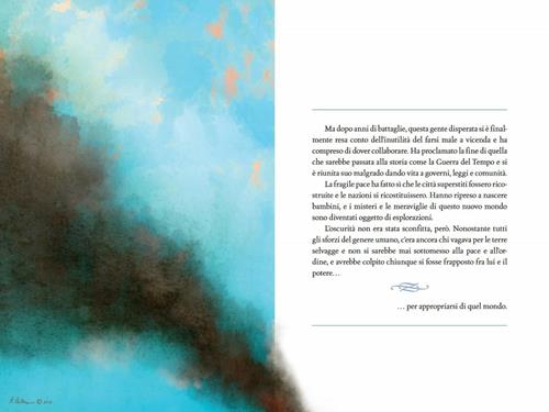 "Sfrecciava sopra New Chicago, i canali e i binari del treno ostruiti dal traffico mattutino di piroscafi e filovie, i marciapiedi gremiti di soprabiti, tuniche in pelle e mantelli di raffinata fattura, un mondo in cui si scontravano suoni e colori, odori di sterco di cavallo e olio di motore, di granturco arrostito nei chioschi e di mare. In lontananza, gli sbuffi di fumo delle grandi navi a vapore e dei robot portuali dipingevano l'alba del colore dell'oro. Diego individuò la ragazza dritto davanti a sé, che fendeva il cielo. Doveva raggiungerla, prima che fosse troppo tardi. Non sapeva perché, sapeva solo di doverlo fare. Qualcosa che aveva a che fare con il tempo, pensò. Si trattava sempre del tempo, che in quel mondo scorreva in avanti e indietro, ma nel sogno... Era agli sgoccioli."