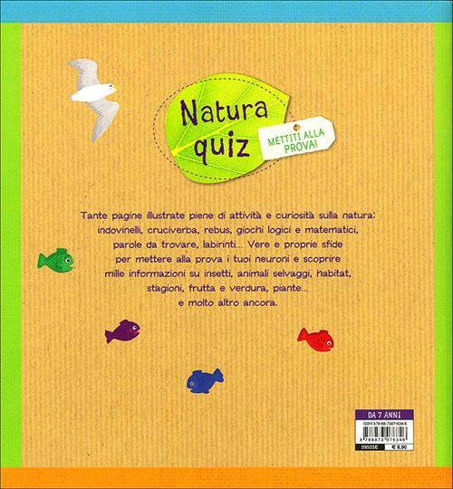 Metti in moto il cervello, fai un po' di stretching alle meningi e aguzza la vista: eccoti pronto per affrontare "Natura quiz"! Tante pagine ricche di informazioni, cruciverba, giochi logici e matematici, parole da trovare, labirinti... Vere e proprie sfide per mettere alla prova i tuoi neuroni e scoprire mille curiosità su insetti, animali selvaggi, habitat, stagioni, frutta e verdura, piante... e molto altro ancora. Età di lettura: da 7 anni.