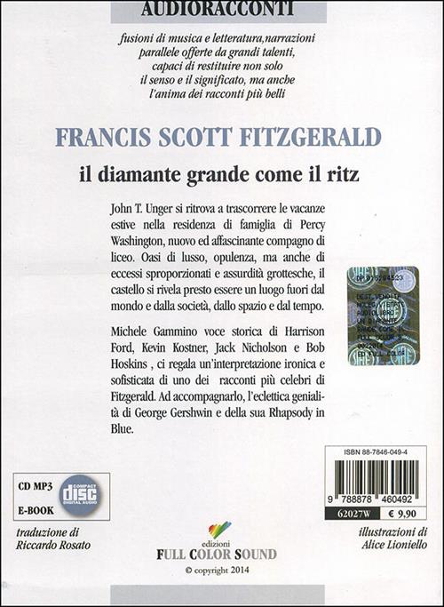 "Il diamante grosso come il Ritz", tratto dalla raccolta "Racconti dell'età del jazz", è un racconto dall'atmosfera surreale. Potrebbe essere definito una fiaba degli anni Venti, periodo in cui il lusso era l'illusione e la mira di tanti. John T. un giovane studente della ricca borghesia del sud viene invitato a passare le vacanze a casa dell'amico Pierce, figlio dell'uomo più ricco del mondo. Questa casa non è segnata in alcuna cartina geografica e la famiglia di Pierce vive isolata dal resto degli Stati Uniti, la loro incredibile ricchezza deve assolutamente rimanere segreta poiché, se venisse scoperta, sarebbe la rovina dei mercati mondiali.