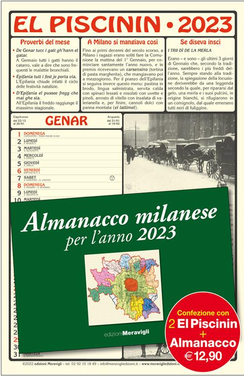 L'unico, autentico almanacco meneghino: modi di dire, antichi proverbi e ricette tipiche accompagnano il cultore della Milano che fu, giorno dopo giorno. In abbinamento omaggio con "El Piscinin 2023" l'"Almanacco milanese per l'anno 2023": una splendida pubblicazione da collezione (album cm 24×16,5: stesso formato del calendario), con uno straordinario apparato iconografico (96 pagine a colori) e 24 testi d'autore (due per ogni mese) per (ri)scoprire storie, aneddoti e curiosità meneghine. (Confezione con 2 Calendari + 1 Almanacco).