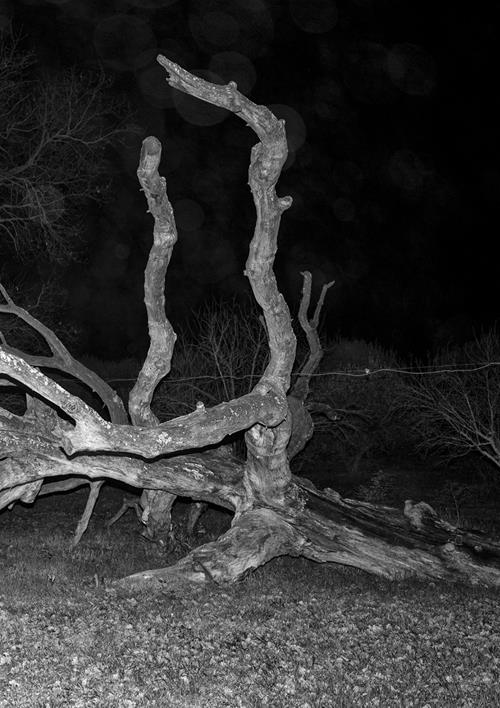 Pietraia is the result of the encounter between sculptor Giulia Cenci and photographer Jacopo Benassi—their practices merging to create a new body of work, where the hybrid forms of her pieces and his visceral gaze generate a shared language of transformation. Introduced by curator Antonio Grulli, the artists met in Milan and then gathered in Pietraia, a rural village where Cenci set up her studio in the former stables of her family’s farm. There, she works with metal to create casts of organic and mechanical bodies—branches and pipes, bones and pistons, human and animal faces—which she assembles and disassembles to shape new, visionary figures. Benassi photographed these creations indoors, in the studio, and outdoors, in the woods. Rejecting conventional modes of documentation, he worked in darkness, using flash and long exposures, fragmenting and multiplying the shapes, turning heavy metal into trails of pure light. Rearranging Cenci’s works into unexpected constellations—relating and contrasting with each other and with the surrounding vegetation—his shots reveal their spectral nature and amplify their phantasmatic presence.