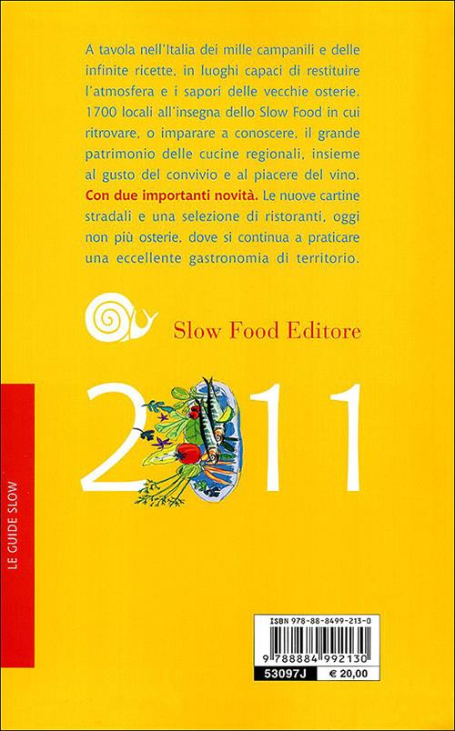 La ventunesima edizione della prima guida italiana ai locali - osterie, trattorie, piccoli ristoranti, agriturismi, enoteche con cucina, wine bar che praticano la cucina delle tradizioni regionali della penisola, affiancando alla cura delle preparazioni un ambiente accogliente, un servizio premuroso, prezzi onesti.