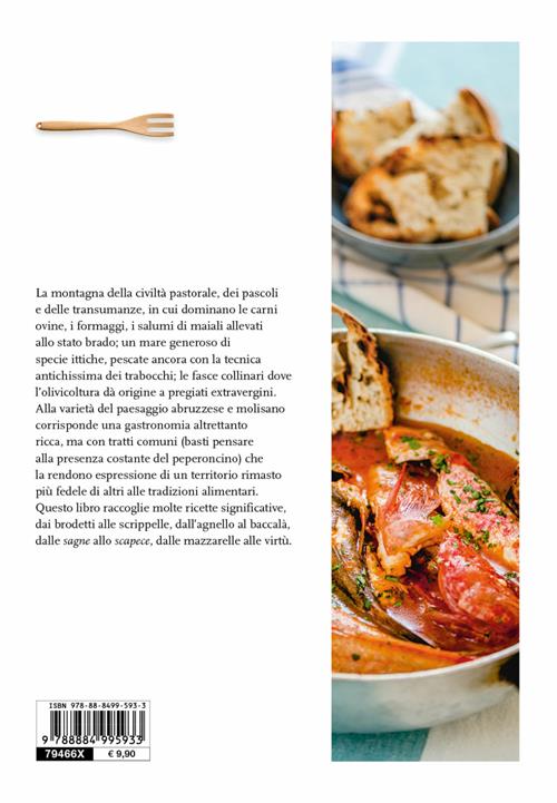 La montagna della civiltà pastorale, dei pascoli e delle transumanze, in cui dominano Le carni ovine, i formaggi, i salumi di maiali allevati allo stato brado; un mare generoso di specie ittiche, pescate ancora con la tecnica antichissima dei trabocchi; le fasce collinari dove l’olivicoltura dà origine a pregiati extravergini. Alla varietà del paesaggio abruzzese e molisano corrisponde una gastronomia altrettanto ricca, ma con tratti comuni (basti pensare alla presenza costante del peperoncino) che la rendono fortemente identitaria, espressione di un territorio rimasto più fedele di altri alle tradizioni alimentari. Questo libro raccoglie 120 ricette significative: dai brodetti alle scrippelle, dall’agnello al baccalà, dalle sagne allo scapece, dalle mazzarelle alle virtù.