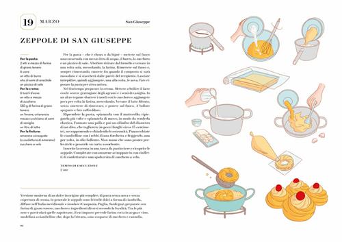 Dalle zeppole di San Giuseppe alle frittelle di Sant'Antonio, dalla pinza dell'Epifania ai pabassinos quaresimali, un viaggio lungo un anno tra curiosità, storie, aneddoti e piccole scoperte legate a ogni dolce. L'Italia è il Paese dei santi, un luogo dove la cultura religiosa permea e scandisce il calendario con feste patronali in ogni dove, dalla metropoli al villaggio, e ricorrenze che hanno profondamente caratterizzato anche la cucina. Questi momenti possono fermare l'intera nazione o singole città per uno o più giorni, lasciando spazio a storie e miti che, nei secoli, hanno contribuito a forgiare il nostro modo di vivere la festa. Il libro, impostato seguendo il calendario, riporta le ricette e le storie di dolci dal forte contenuto simbolico, dal panettone, re delle tavole natalizie, al più curioso dolce della più piccola festa locale. Un viaggio tra storia e cultura, con la possibilità di portare in tavola un dessert diverso per quasi ogni giorno dell'anno. Un ricettario sì, ma anche un libro ricco di curiosità legate alla tradizione, arricchito dalle immagini dei dolci principali e da tanti consigli step by step per replicarli perfettamente a casa nostra.