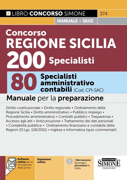 Concorso Regione Siciliana 200 specialisti. 80 specialisti amministrativo contabili (Cod. CPI-SAC). Manuale per la preparazione. Con espansioni online. Con software online per la simulazione della prova